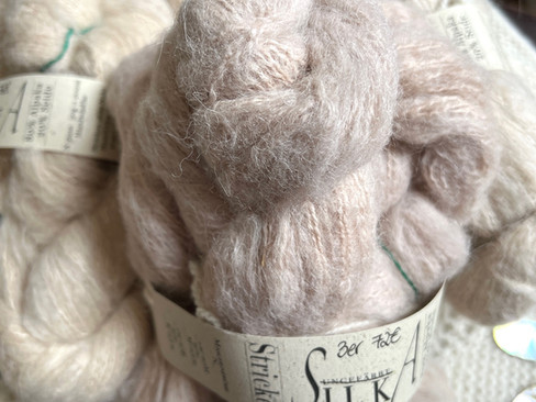 Links ist die Snefnug von CaMaRose, die von vielen geliebt wird. Ein typisches Schlauchgarn aus Alpaka+BW+Merino mit einer Lauflänge von 110m auf 50g. Preis: 8,95€