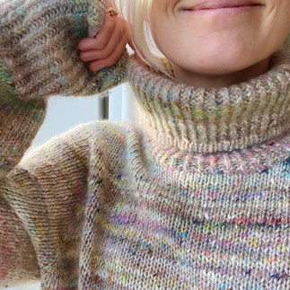 Der Terrazzo Sweater von PetiteKnit wird von oben nach unten, zuerst in Reihen auf einer Rundstricknadel gestrickt, um den Halsausschnitt zu formen, danach weiter in Runden. Die Passe ist so konstruiert, dass zuerst die Schulterzunahmen in Hin- und Rück-Reihen erfolgen. Danach werden die Ärmelzunahmen gestrickt und zuletzt ein Stück mit klassischen Raglanzunahmen. Der große Rollkragen wird am Ende im verschränkten Rippenmuster gefertigt, indem Maschen am Halsausschnitt aufgenommen werden.